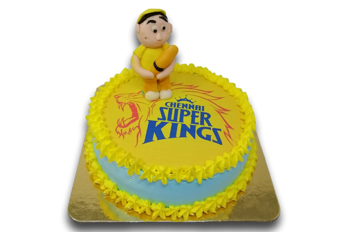 Ideal birthday cake for Chennai Super Kings fans, order 1 day in advance for home delivery in Chennai. Option available for a hand-crafted batsman fondant toy which is full edible. Eggless options available.